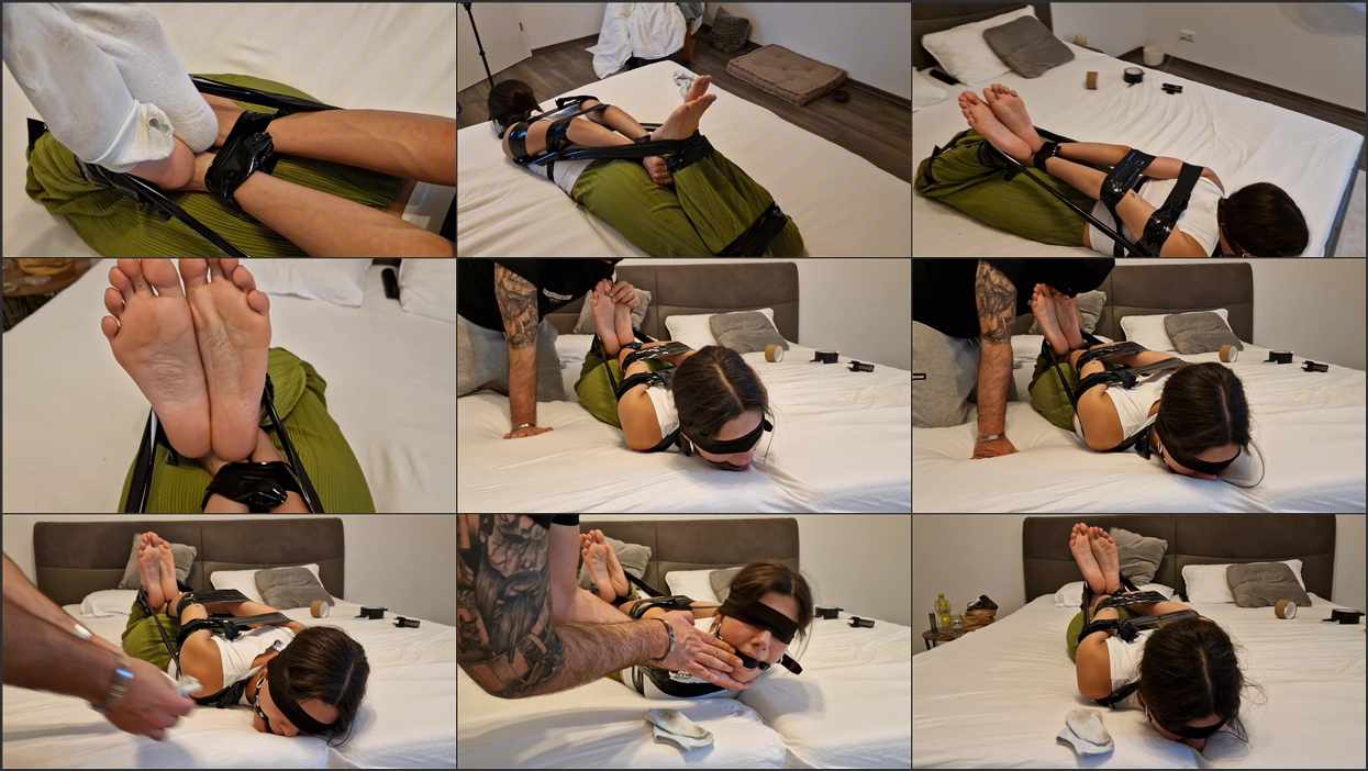 Today I’m taped into a tight hogtie, gagged with a large ball gag, and blindfolded. The video starts with me in white socks and ends, of course, barefoot. He licks my perfect toes and soles. Face visible.