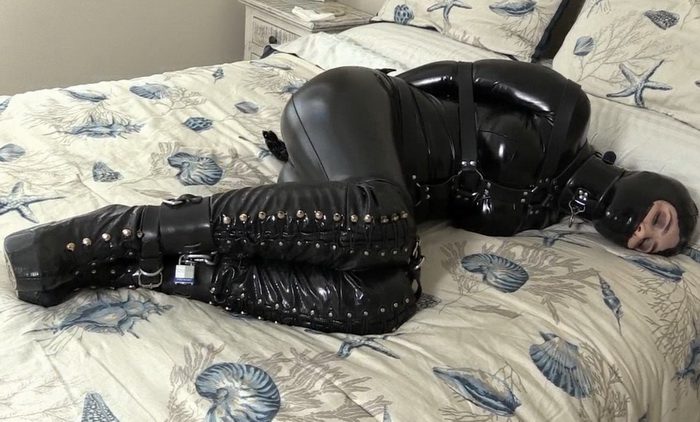 Instilled with heretofore untapped fantasies due to her first time sensually submissive restraint activities with Bondage Practitioner Boyfriend, Tilly has sadistic plans for him today. She awaits his arrival in feminine curve accentuating black vinyl catsuit, gloves, and over knee lace up high heel boots. In Mistress McReese mode, Tilly struts while wielding a rubber flogger, anxious to use it on his flesh to motivate submission to her. Her plans go quickly awry though as she finds herself strutting once again, but now she is stuffed mouth tape gagged, Gwen hooded, posture collared, strapped tight with a leather body harness, wrists cuff locked, and ankles chain hobbled. She is furious, but there is nothing she can do as he ogles her from afar and close as his hands roam her helpless body. With no choice now but to comply, bound up Tilly follows his silent lead into a bedroom where her knees and ankles are strapped together. She struggles to escape the unyielding leather bondage, her voice muzzled by the gag and hood, as boyfriend savors the view of his angry damsel. In time, Tilly thinks he is going to free her, but his hands are there to tighten the body harness. Extremely disappointed she will remain bound and gagged for the foreseeable future; the prisoner’s attitude changes from defiance to contrition.