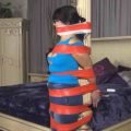 My romantic getaway with Tilly was almost immediately spoiled by her endless rude complaints about the luxury hotel room I had booked. Refusing to even take a moment to actually view the room, she bitched and moaned until I had heard enough. If she wasn’t going to meet me halfway, she could just stay here by herself. Grabbing her, I quickly taped her wrists together behind her back, and began wrapping her upper body in the sticky stuff, thrusting her bi boobs forward. To say it was a beautiful sight was an understatement! To end her complaints, I stuffed her mouth with a large ball gag and went to work on her legs. Furious, she thrashed about in her bondage but the tape refused to give. She was still to loud for my liking, so I added a few strips of micro foam tape before heading off to the next room for a shower. Tilly struggled like hell, but it was absolutely futile! She was stuck fast, groaning and grunting into her gag. When my shower was finished, I returned to find her attitude had not improved one bit, nor had she stopped bitching! Since she couldn’t seem to learn her lesson, I improved the gag with several winds of black tape, followed by even more of the awful duct tape! The look of misery on her face made me very pleased indeed, but something was still missing. She STILL had too much movement! Lowering her to the floor, I quickly hog-taped the bitchy beauty, leaving her to squawk and sob into her very effective gag as she rolled around, mashing her tits into the carpet! As for me, I was off to do some sightseeing!