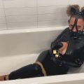 Naughty Taylor is put in tight bondage, topless, in piggy tails, in sexy form fit leggings and high heels. She’s fitted with a wide neck ring collar, confined in a cotton rope body harness, rubber gloved, her wrists bound in cotton rope and cinched to the bottom of the stool for no escape. Her ankles have been secured to the stool legs with chains and padlocks. A crotch rope is also tied nice n’ snug so she feels every moment of her struggle before being gagged with a rubber pump gag and pvc tape to keep her perfectly quiet.