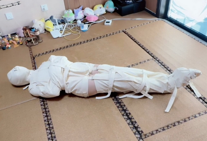 The desperate journey of an 80-pound female student: extreme restraint with a vibrating chastity belt and straitjacket; struggling in out-of-control mode, rolling on the ground unable to break free, reaching a climax of despair.