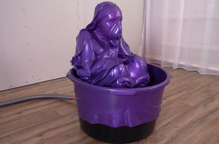 Sonya accidentally sat in a basin of lilac latex, and the vacuum immediately caused it to stick to her body. The latex gripped her tightly and rigidly, and she could only move slightly and moan softly.