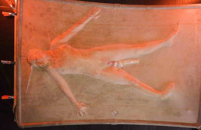 Vanna Smith approaches the vacbed, strips, puts on ear muffs for further sensory deprivation, and slides inside. Once fully secured with the vacbed shut, the vacuum is turned on, the air sucked out of the bed, trapping her in place with as little movement as possible, surrounded by the rubber latex with which she cannot escape from. A Hitachi vibrator with a dildo and clit attachment is shoved in her pussy and placed on her clit, giving her continual stimulation while she remains trapped in the vacbed.