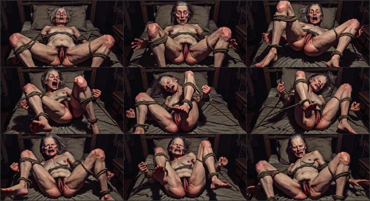 Very ugly 70yo granny finds herself tied up and burning with horniness. Her loose wrinkled skin stretches against the tight ropes as pleasure takes over. Watch this hideous old woman build up to a massive orgasm, moaning uncontrollably and shaking violently until she explodes with loud desperate screams. Perfect for ugly granny bondage and mature orgasm fetish.