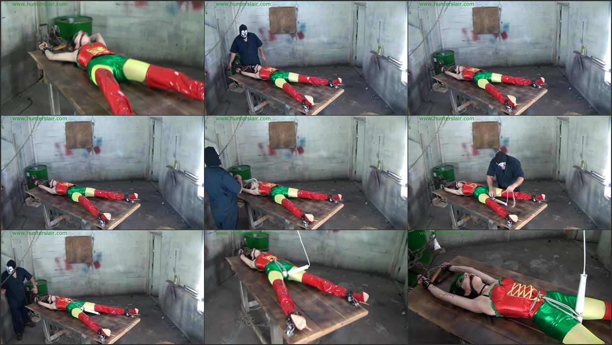 Hapless Robyn has been captured while prowling around the lair, now she finds herself stretched out on the Hunter’s table tied down in leather cuffs. Her wrists are cuffed together above her head attached to a chain running up to a winch and her booted ankles are spread and locked to a set of rings mounted at the base of the table. A ball gag is jammed deep in her mouth. She struggles helplessly on the table, pulling desperately at the cuffs but there is no escape. The Hunter comes in and tells her that she is going to be bait to trap Batwoman in his lair. But it might be a long wait and he doesn’t want her to get bored. The Hunter cranks the winch above her head pulling and stretching Robyn’s hands high above her head and stretching her bound tight across the table. Then he leaves her helplessly stretched on the table. When her returns he ties a rope around her tiny waist then pulls the rope up her ass and between her legs. The Hunter ties a wand vibrator to the crotch rope pressing the head of the vibrator tight against her pussy. He attached the other end of the vibrator to a chain hanging down from an overhead pulled taut to keep it in position as she struggles…