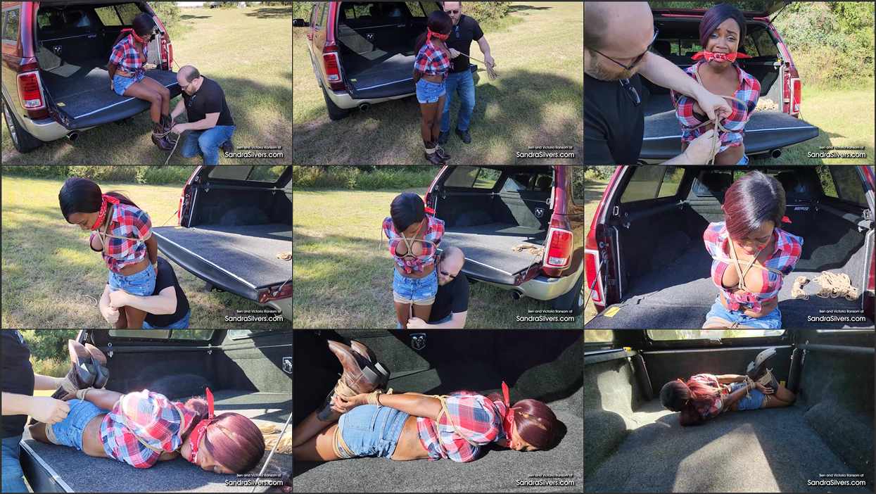 It’s not clear what she’s done to deserve this, but lovely Victoria has been captured in a deserted spot by a bad guy, who wastes no time hustling her to his car. She is dressed in the classic cowgirl outfit: plaid shirt, open to display her impressive cleavage and knotted to show off her midriff, skimpy denim shorts to showcase her legs, and leather boots to complete the look. Hands bound behind her back and with her mouth cleave-gagged with a thick, knotted bandana, she’s already quite helpless, but worse follows…
