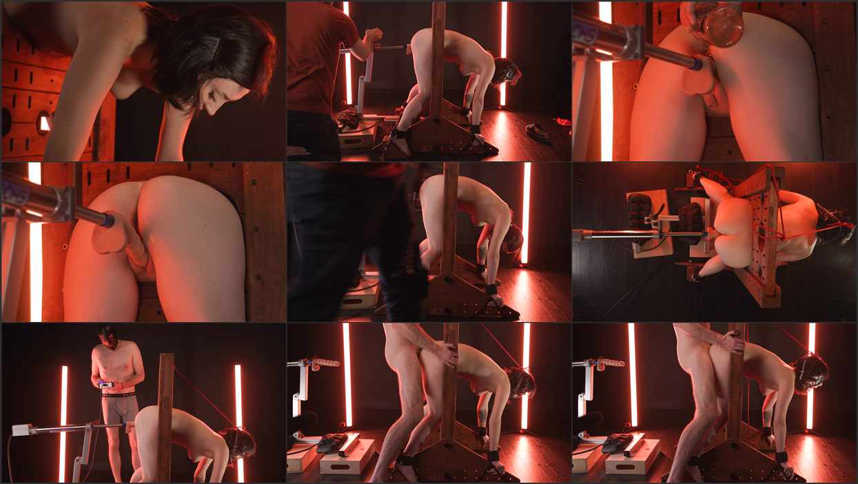 Vivian Greene bends over in the wooden stock, ass up and exposed, face down, ready for the fucking machine dildo to enter her vaginal cavern. The dildo is shoved inside her hole, turned on, as she undergoes the relentless in and out of the machine while unable to move from it’s path.
