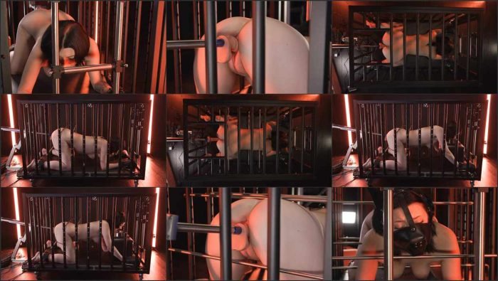 Vivian Greene crawls into the slave cage completely naked, the cage door closing and locking behind her, leaving her trapped inside. Her hands are then slid into bondage paws which are locked in place, bound to the bars of the cage, while her ankles are cuffed to the back bars. The fucking machine is moved into place, the dildo pushing into her vagina, as the machine begins moving in and out fucking the pet, ramping up and down in speed over the duration of her pet slave training.