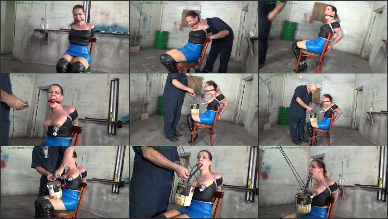 Sexy blond Whitney struggles helplessly in a chair cruelly bound and gagged. Her elbows are crushed tightly together behind her back with her wrists pulled up high forcing her elbows to jut out from the back of the chair. Her booted ankles and knees are also tightly tied and a big red ball gag is jammed between her teeth and strapped in tight. The Hunter comes in with more rope and pulls her bound feet back under the chair and tethers them to her bound wrists. She watches helplessly as he pulls her tits out of her tiny crop top. Whitney protests into her gag as he places vacuum tubes over her tits and then scream in pain as he turns the screws, sucking all the air out of the vacuums. Whitney poor tits and nipples are sucked into the vacuum tubes. She then watches in XXXX as he loops some leather cords around the screws on the vacuum tubes and runs the cords up to a pulley. He places a paint can on her knees and ties the end of the leather cords to the handle on the paint can. Whitney can feel the weight of the gallon of paint that is precariously perched on her knees. She cries in terror trying to keep still terrified that the paint can will fall off her knees and pull and stretches her poor stretched tits. The Hunter watches in amusement as Whitney begs and cries into her gag. He then changes his evil game by unbuckling the strap on the ball gag and keeping the ball jammed between her teeth he ties the leather cord from the handle of the paint can to the strap of the ball gag. The can is now suspended in the air held in place by the ball gag between Whitney’s teeth. Her eyes go wild over the gag as she realizes that if she looses her bite on the ball the paint can will swing away and the entire weight of the can will jerk, pull and stretch her swollen tits.