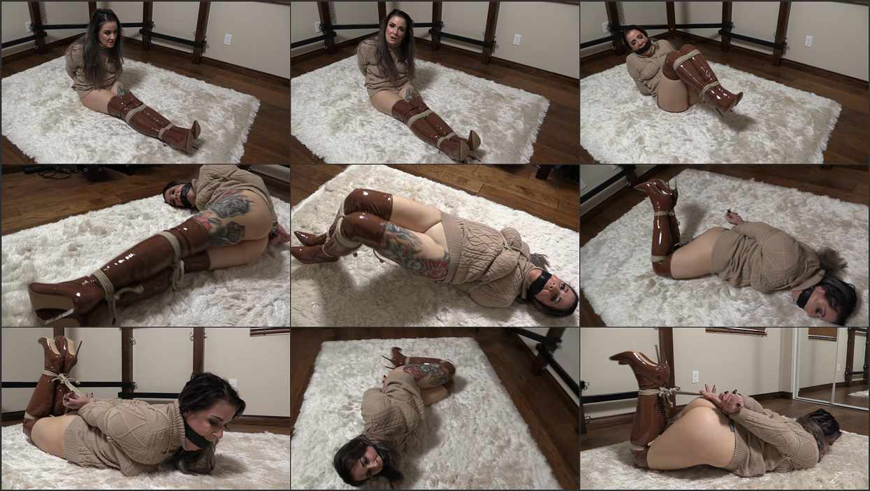 My friend found the new Steve Madden Viktory shiny brown high heel vinyl stretch boots in the closet and of course had to wear them. Whitney may have received a hint they would be her size. The scene opens with Whitney sitting on a soft rug in the dungeon. Her wrists are crossed and tied with hemp rope. Her torso and breasts and upper arms are held fast with another longer length. Her ankles are tied securely. It is a tight tie. Viewers will see Whitney will not be able to escape without help, and movement is difficult indeed. Whitney wants to go out in her new boots, but I intend to enjoy her helpless condition for a while. Around the one-minute mark another length of hemp has been wound tightly below her knees. Whitney continues to attempt convincing her host to let her out. At the three-minute mark a cover ball gag has been inserted. We used this one during our very first shoot in 2013. It is a daunting gag, allowing nothing more than garbled gag sounds from her throat. At the seven-minute mark, helpless Whitney has been hogtied and left alone while I go shower for our dinner date.