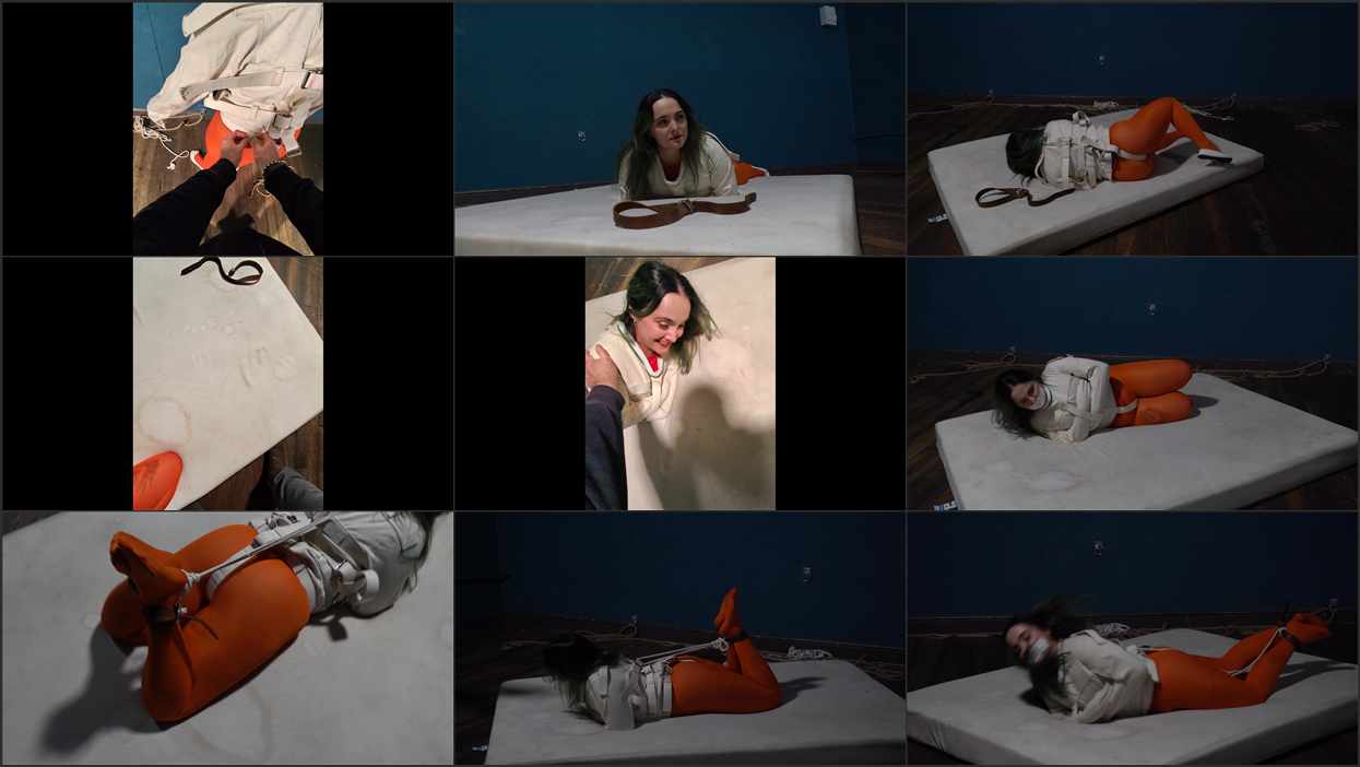 Zara is one tough cookie, and a wriggler. On the run we soon catch up with her and get her into the jacket. SEE how it feels to put her in with POV strapping in time. We use a leather belt to secure her feet, but she soon gets free of that simple restraint, so we bring her back and use some SJ strapping to hogtie her on the mattress. No escape from that one!