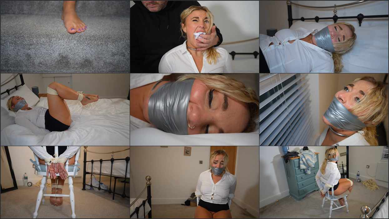 Zoey arrives home from a long day but unbeknown to her an intruder lies in wait. She heads to the livingroom and removes her high heels and gives her tired bare feet a good rub before she heads to the bedroom to get changed from her work gear. Here she is jumped from behind by the intruder. He quickly grabs her arms and clamps his hand hard over zoeys lips to prevent her from screaming out. We next see Zoe on the bed already bound hand and foot. Her wrists tied behind her back with rope, along with her ankles and legs. Befire zoe can protests the man stuffs two large white handkerchiefs into her big mouth and tightly gives her a wrap around tape gag. He then leaves poor zoey to struggle on the bed. She wriggles round and squirms on the bed, attempting to call out for help through the tight and efficient gag, but its useless, her screams are muffled and her crys go unheard. She gets to her feet and hops to the window in an attempt to catch someone’s attention from the outside. She mmmphs and groans but unfortunately for her the man returns and ties zoey to a chair. He also ties her big toes together and tgen tiedms a string from her toes to her wrist which cause zoeys toes some discomfort as they hang in the air. Again zoey cries out but it is all in vein as. She has no idea how long she will be left in this situation.