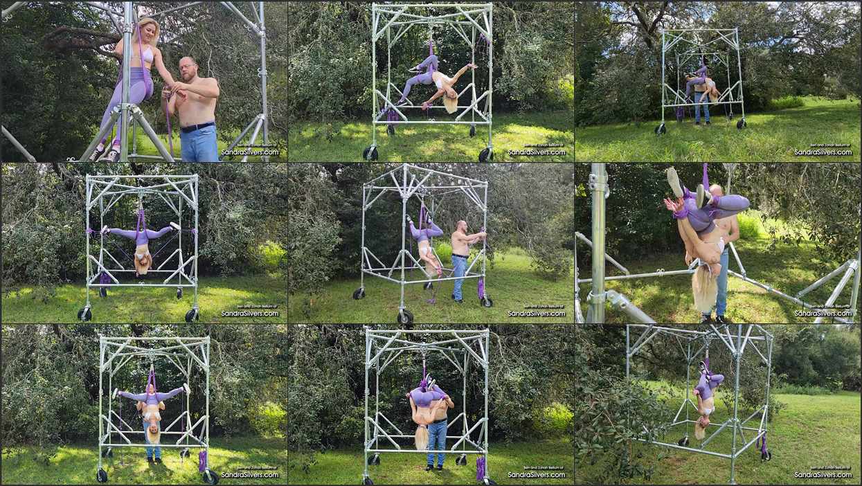 Zonah Bellum’s aerial prowess meets its match as Ben, broad shoulders shirtless above trademark blue jeans and black boots, grips her inverted form, pulling her into predicaments with commanding hands. Zonah’s spandex leggings-clad legs, thighs and buttocks become wrapped in rope like a vice, the fabric shimmering under the sun, while her bikini top strains to contain her upside down C-cup tits, pulled to earth in gravitational vulnerability. Purple ropes entangle her body, linking her to the wheeled structure of steel, as she hangs helplessly in M.O.N.S.T.A.R. ‘s arms – a sensual siren seized within serenity, her restraint brings a surge of relief, rope allure amplified in this asked for outdoor ordeal.