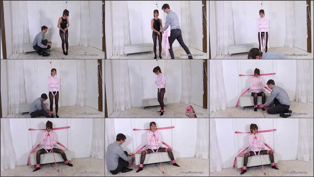 Straps on straps, a live rigging of cutie Zura who’s already stuck firmly in this straitjacket. A few transitions from standing to sitting and seeing which predicament she likes to try to struggle out of the most.